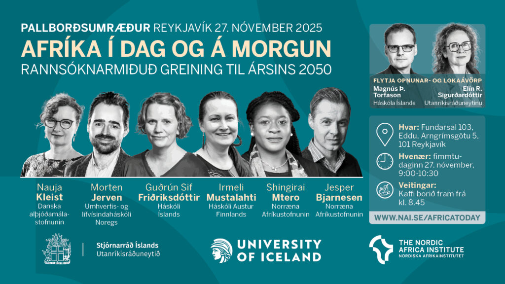 Pallborðsumræður NAI um Afríku Post author:Stefan Post published:21/11/2025 Post category:Tilkynning You Might Also Like Fest Afríka Reykjavík 19.09.25 14/09/2025 Félagið Afríka 20:20 gefur út nýja bók: 18/03/2024 Málstofa 15/05/2023